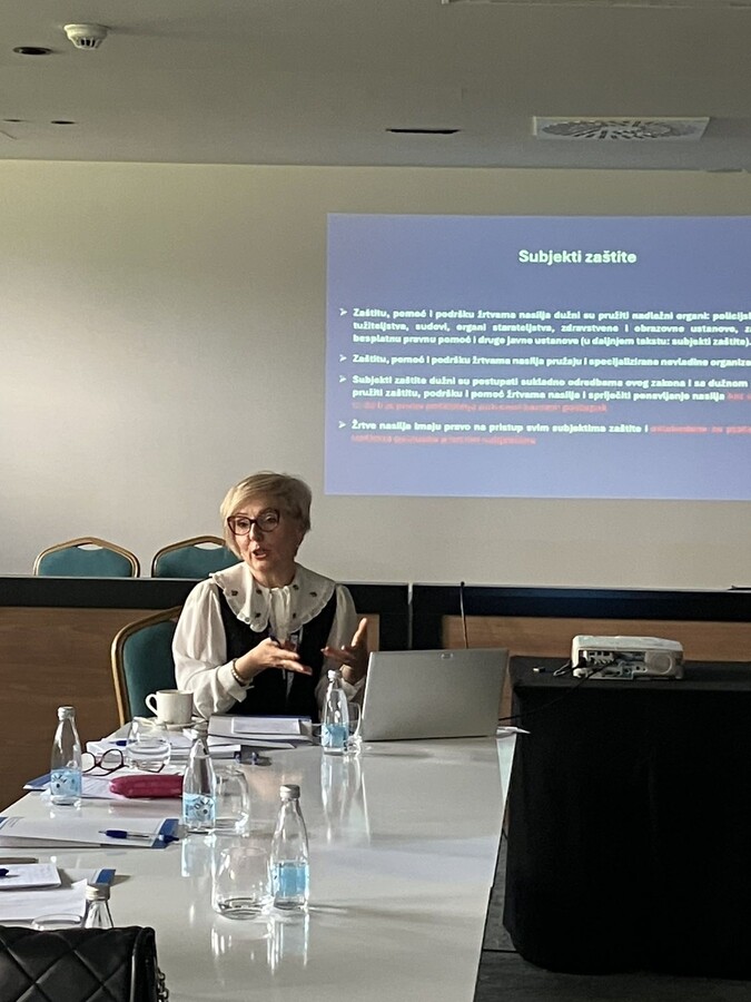 Amra Hamidović, Pravna savjetnica OSCE-a je predstavila Zakon o zaštiti od nasilja u porodici i nasilja prema ženama u FBiH sa fokusom na novine koje je novi zakon definisao. Između ostalog to se odnosi na to da pojam žena uključuje i osobe mlađe od 18 godina. Da su radnje nasilja precizno opisane, a da je proširena definicija članova porodice. Dijete je označeno kao žrtva nasilja u porodici ako je bilo prisutno pri radnji nasilja, a prava žrtava nasilja su takodje proširena. Najznačajnija novina u zakonu je procjena rizika koju radi policija u saradnji sa ostalim subjektima zaštite. Definisane su hitne mjere zaštite koje izriče policija. Novina je i pravo nasilnika na kontakt sa djetetom sto je u nadležnosti organa starateljstva. Regulisan je status sigurnih kuća, a kršenje zaštitnih mjera je krivično djelo.